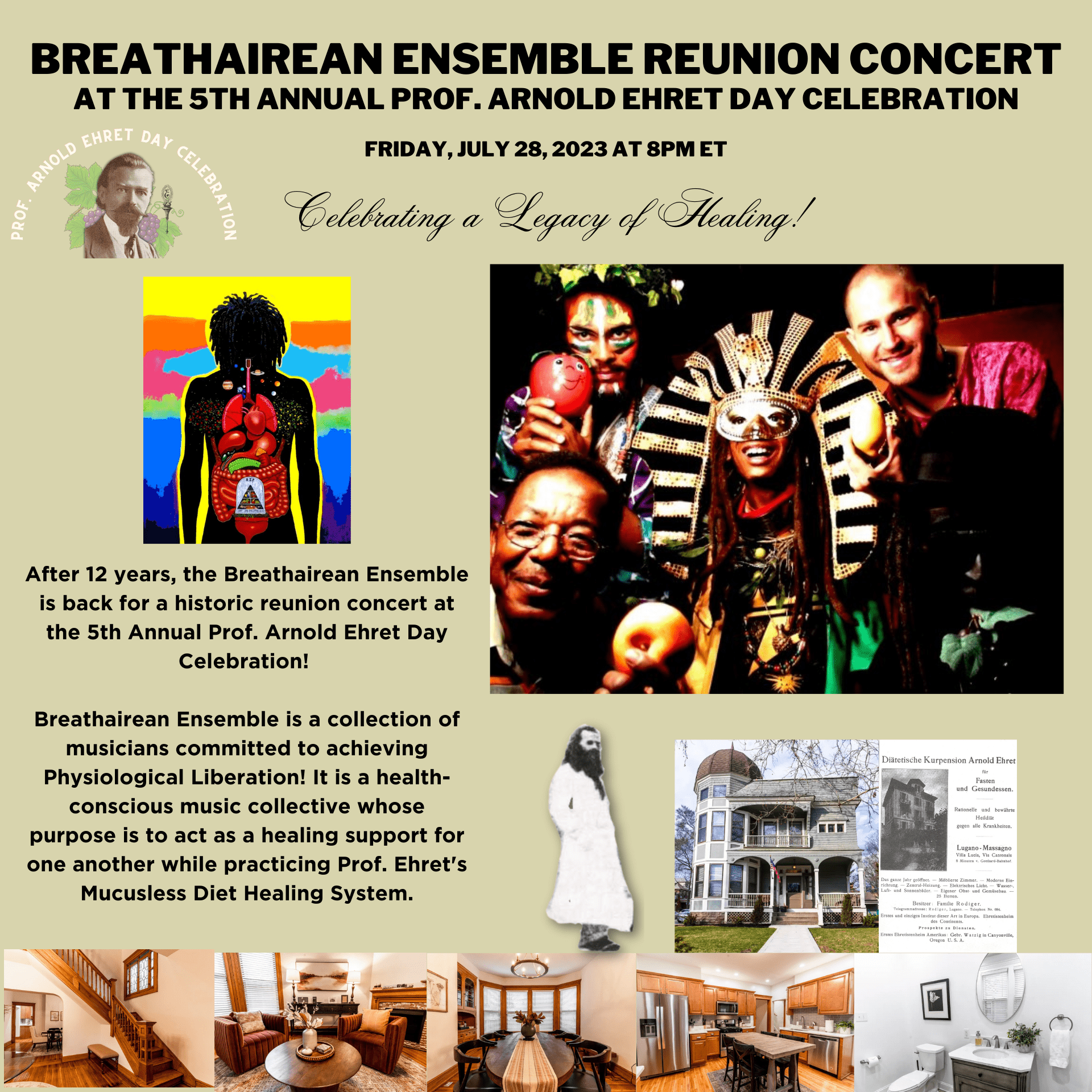 This will be an intimate gathering where we connect with other members of the community and celebrate the life and legacy of Prof. Arnold Ehret with some great mucus-free food, music, live streaming, and other creative activities. This will be a big Mucus-free Party!